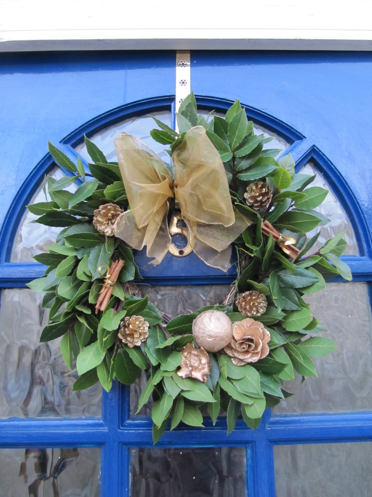 For the last 3 years I've also made my own Christmas wreath for the front door.  The first time, I went to a workshop at a local National Trust property to learn how to do it which was brilliant.  They had a barn full of enormous piles of foliage from around the estate.  Now, I don't have an enormous estate and I didn't want to go and buy Christmas foliage so I hit on the idea of using the clippings from my bay tree which usually needs tidying up by this point in the year.  So now I get to make a home-made, home-grown wreath for free which makes me feel even more smug!